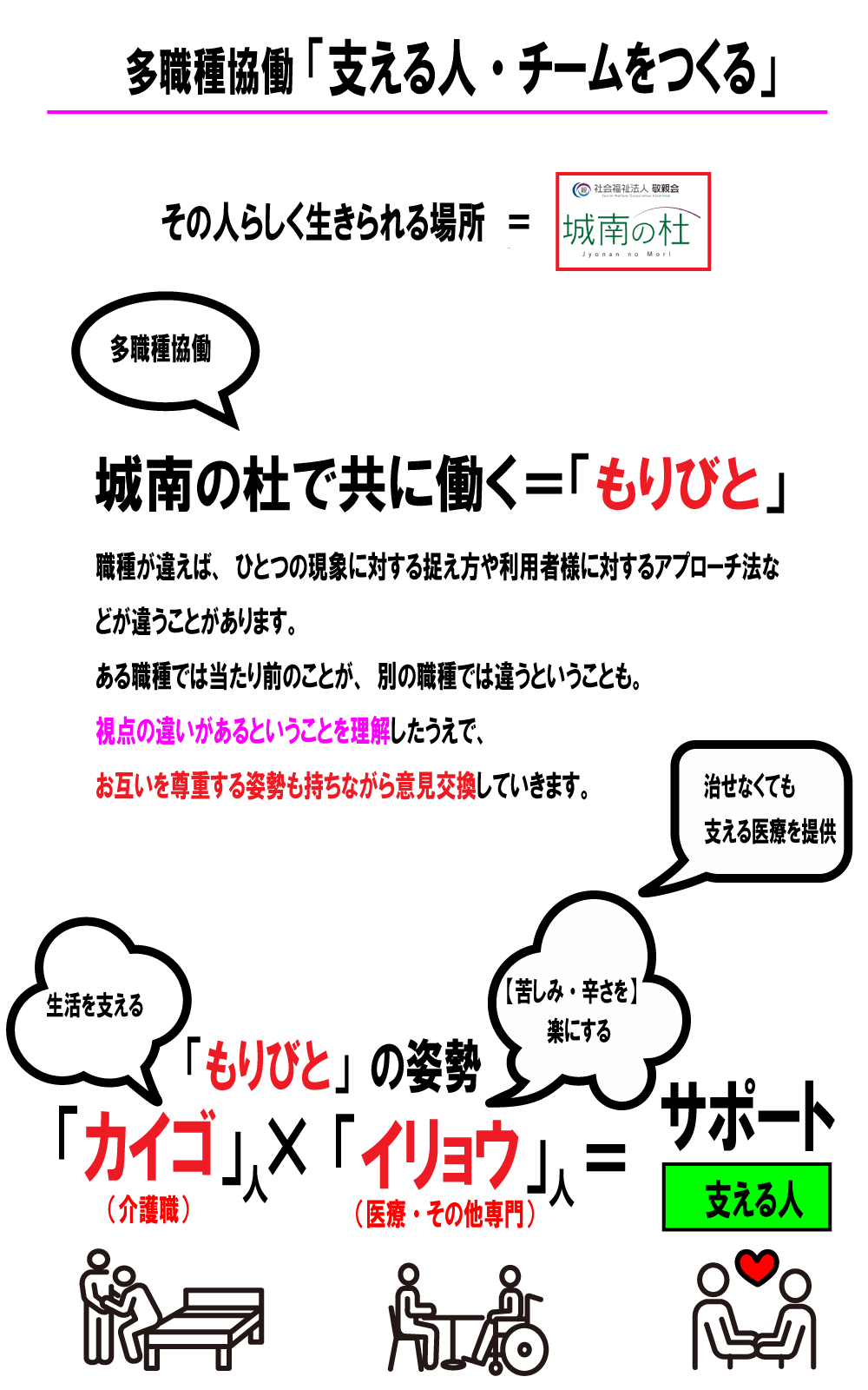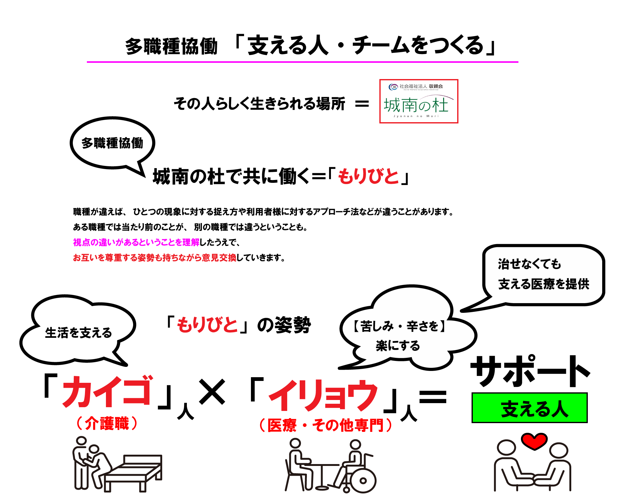 私たち城南の杜は、共に支え合い、尊重し合い、笑顔溢れる職場を作り・育む事を目指しています。
